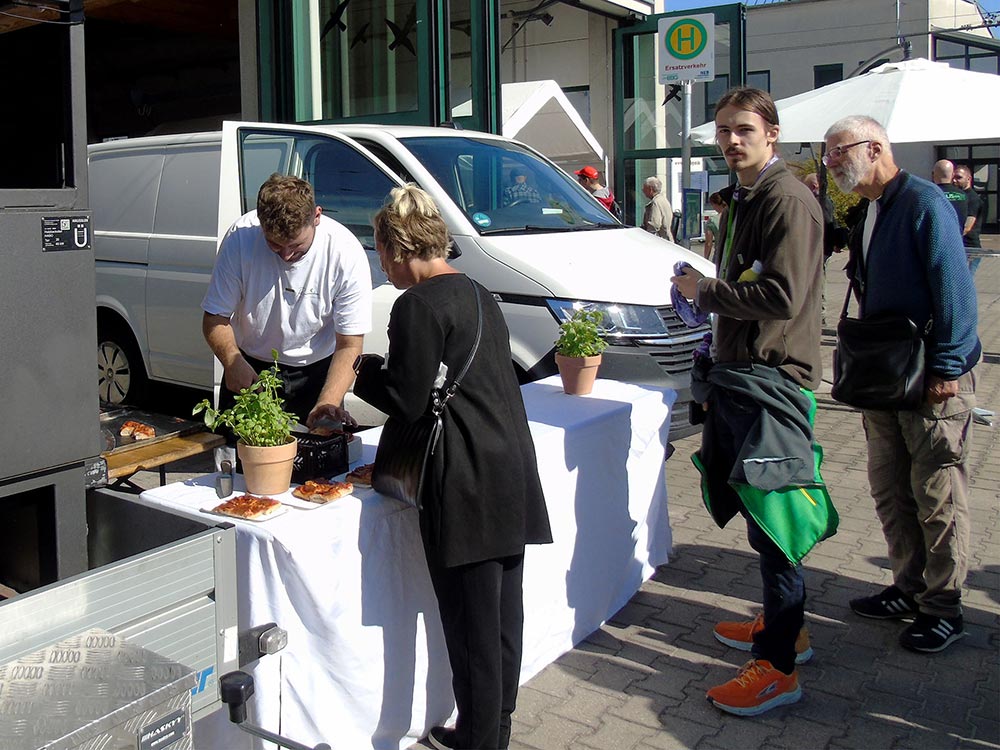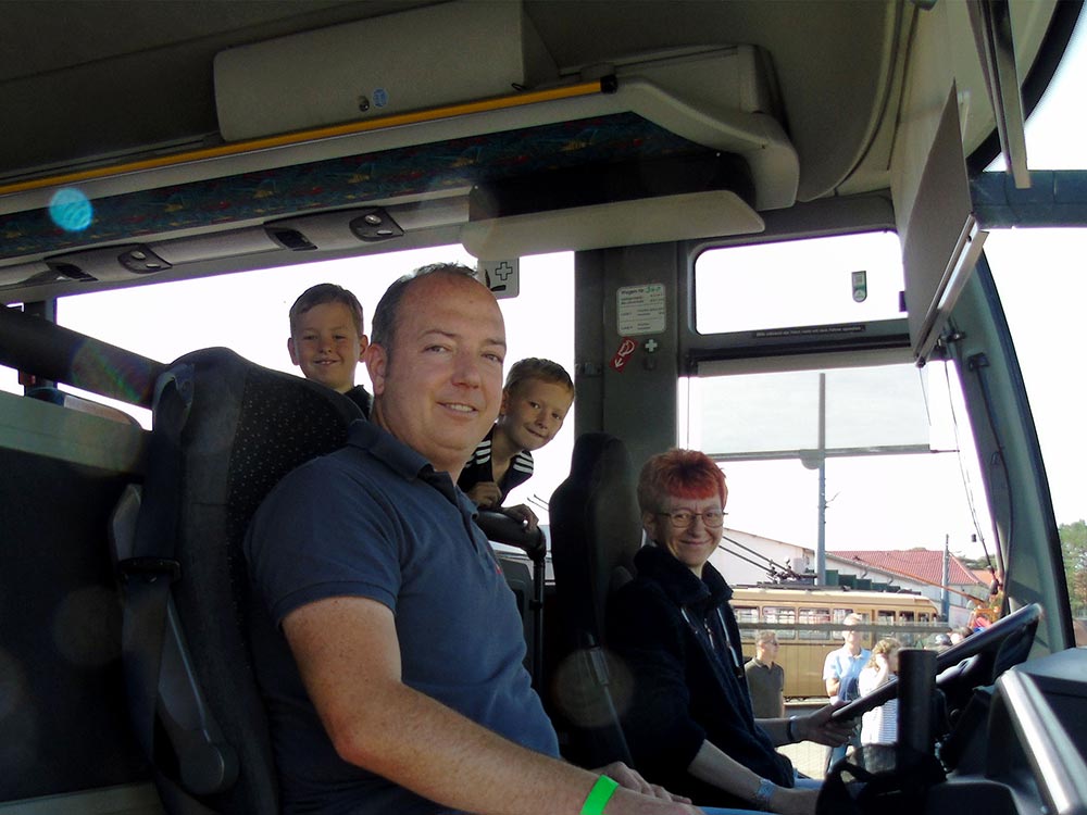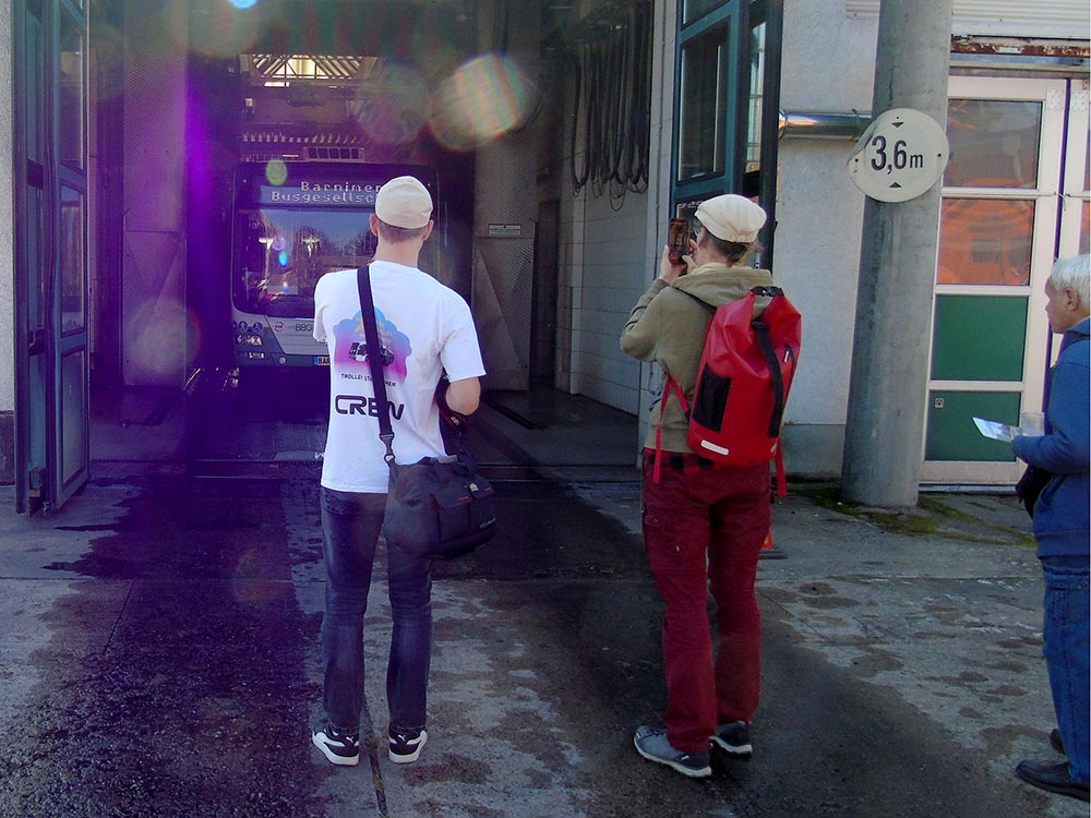 Besonders starker Andrang forderte unsere Mitarbeiter, die den Gästen Einblicke in ihre Arbeitsplätze gewährten. So wurden ununterbrochen Besuchergruppen durch unsere zentrale Leitstelle und die Werkstatt geführt. Wer einen modernen O-Bus einmal aus einer ungewöhnlichen Perspektive betrachten wollte, der stieg ihm wortwörtlich aufs Dach, wo unsere Mitarbeiter die Technik von oben erklärten. Stets voll besetzt waren die ununterbrochenen Fahrten mit einem Bus durch die Waschstraße. Wer der BBG mit einem Video-Gruß zum O-Bus-Jubiläum gratulieren wollte, der wurde als Dankeschön mit einem Eberswalder Spritzkuchen im grünen BBG-Design belohnt.