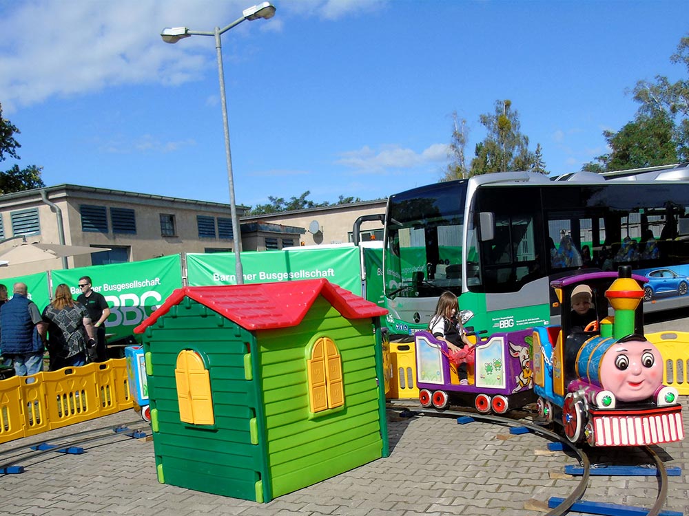 Dicht umlagert waren stets die Angebote des Kinderprogramms: Kreativität war gefragt beim Bauen von O-Bus-Modellen aus Getränkekartons (Umweltbildung der Kreiswerke Barnim), bei der Gestaltung der Naturschutzeule (Haus der Naturpflege Bad Freienwalde) und bei unserem Malwettbewerb "So sieht der O-Bus der Zukunft aus". Die Kindereisenbahn des Verkehrsverbunds Berlin-Brandenburg (VBB) lud zu Rundfahrten, unsere Hüpfburg zum Herumtoben ein. Unterhaltung boten die Vorstellungen des Kasper Theaters Rixdorf, das Kinderparadies Nordend glänzte mit Glitzer-Tattoos und verschönerte das ein oder andere Gesicht nicht nur der ganz Kleinen.