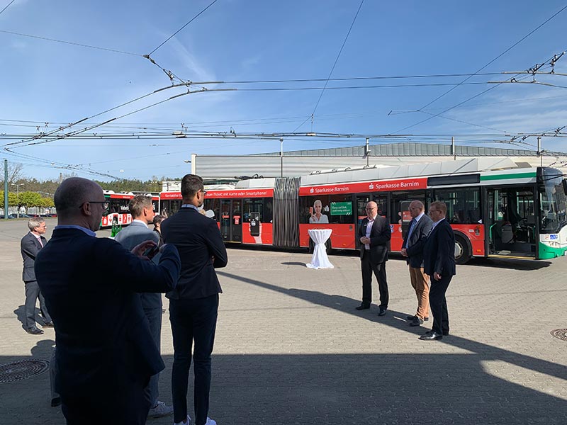 Am Freitag trafen sich Vertreterinnen und Vertreter der Sparkasse Barnim sowie der Barnimer Busgesellschaft auf dem Betriebshof in Eberswalde, um den Auftakt des kontaktlosen Bezahlens in den Fahrzeugen der BBG vorzustellen.