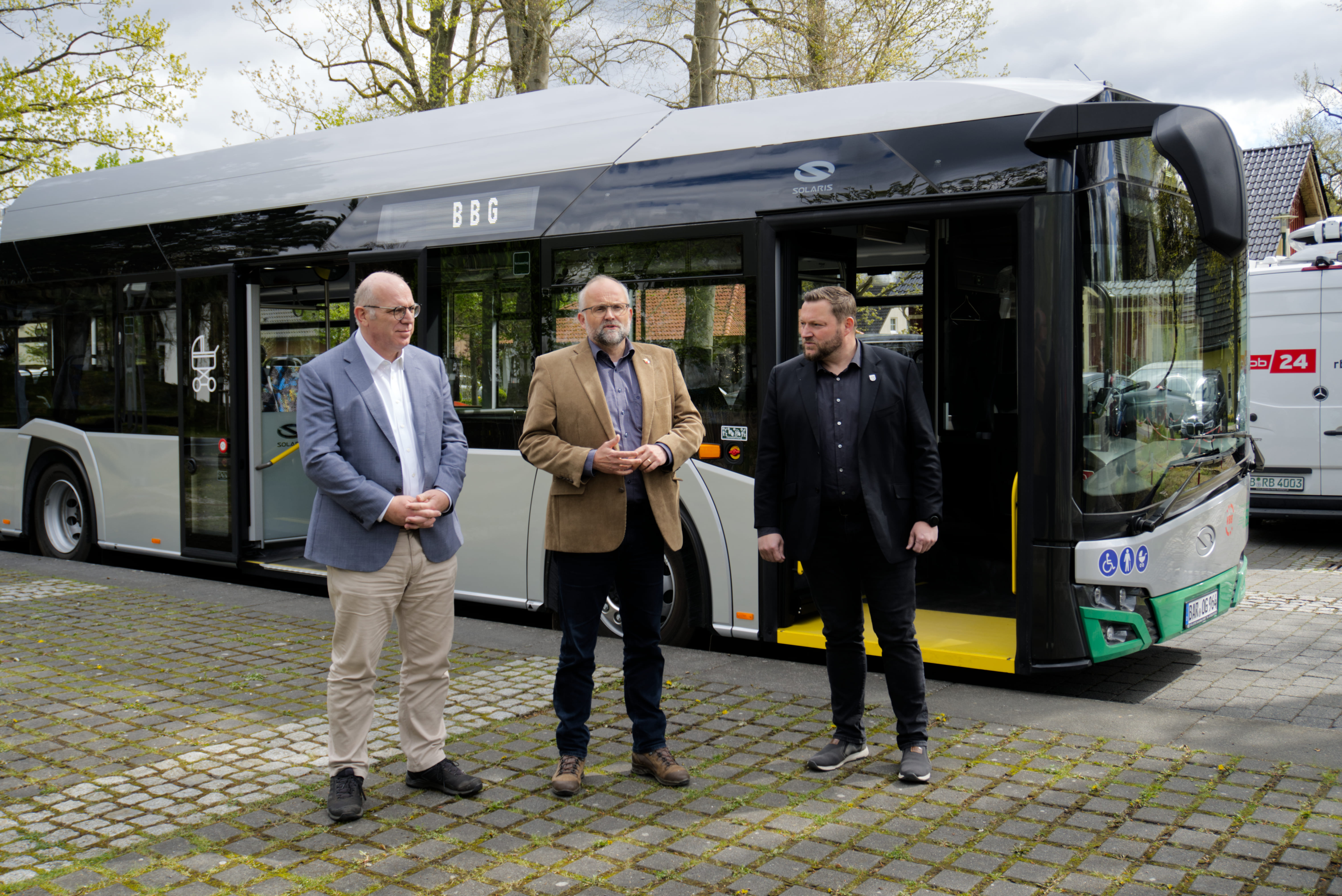 Zeit für die neue Generation! Nachmittags am 18. April 2024 – einer der beiden neuen O-Busse fährt geradezu lautlos in die Haltestelle und wird bereits erwartet. Der Barnimer Landrat Daniel Kurt und der Bürgermeister der Stadt Eberswalde Götz Hermann stehen gemeinsam mit Geschäftsführer Frank Wruck und Gästen sowie der Presse schon bereit. Der Bus wird sofort gründlich in Augenschein genommen – viel Zeit bleibt nicht, denn der offizielle Teil beginnt direkt.