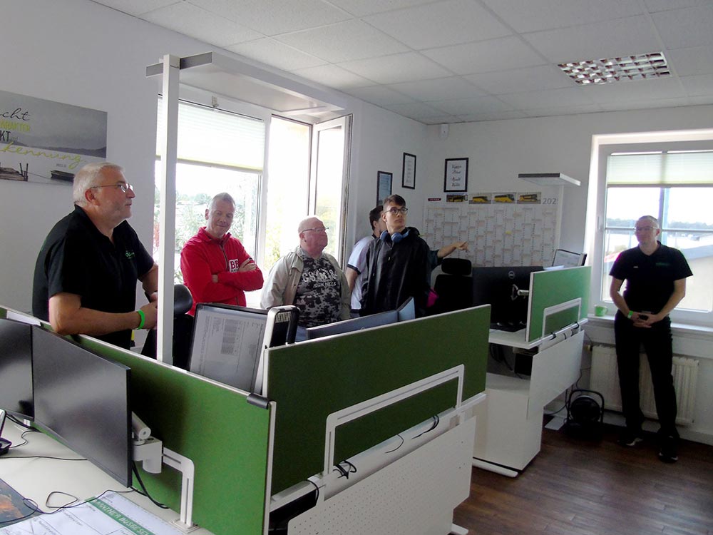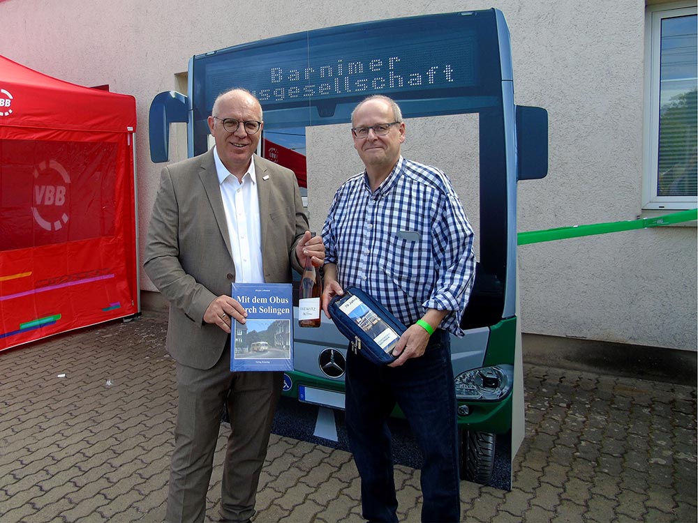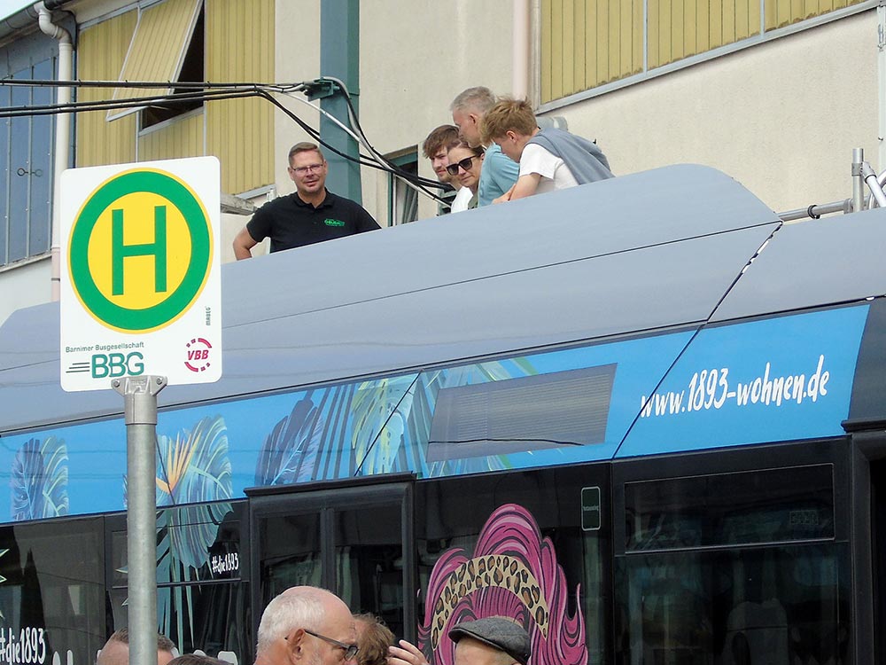 Besonders starker Andrang forderte unsere Mitarbeiter, die den Gästen Einblicke in ihre Arbeitsplätze gewährten. So wurden ununterbrochen Besuchergruppen durch unsere zentrale Leitstelle und die Werkstatt geführt. Wer einen modernen O-Bus einmal aus einer ungewöhnlichen Perspektive betrachten wollte, der stieg ihm wortwörtlich aufs Dach, wo unsere Mitarbeiter die Technik von oben erklärten. Stets voll besetzt waren die ununterbrochenen Fahrten mit einem Bus durch die Waschstraße. Wer der BBG mit einem Video-Gruß zum O-Bus-Jubiläum gratulieren wollte, der wurde als Dankeschön mit einem Eberswalder Spritzkuchen im grünen BBG-Design belohnt.